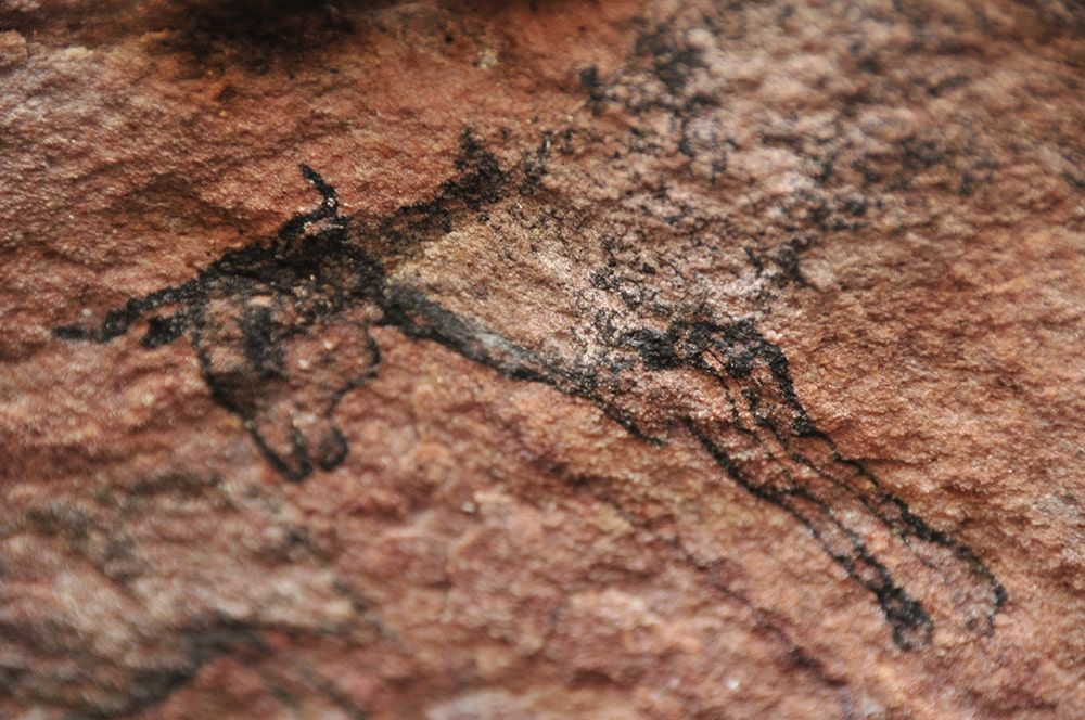And we can see it too in ochre paint, emerging from the rock face are three Shamans transformed into humans with animal heads, faces upturned towards a string of light coming down from the sky. They are bleeding from the nose and have ochre smears across their bodies where the ‘n/om’ or supernatural potency has been activated at the base of the spine.